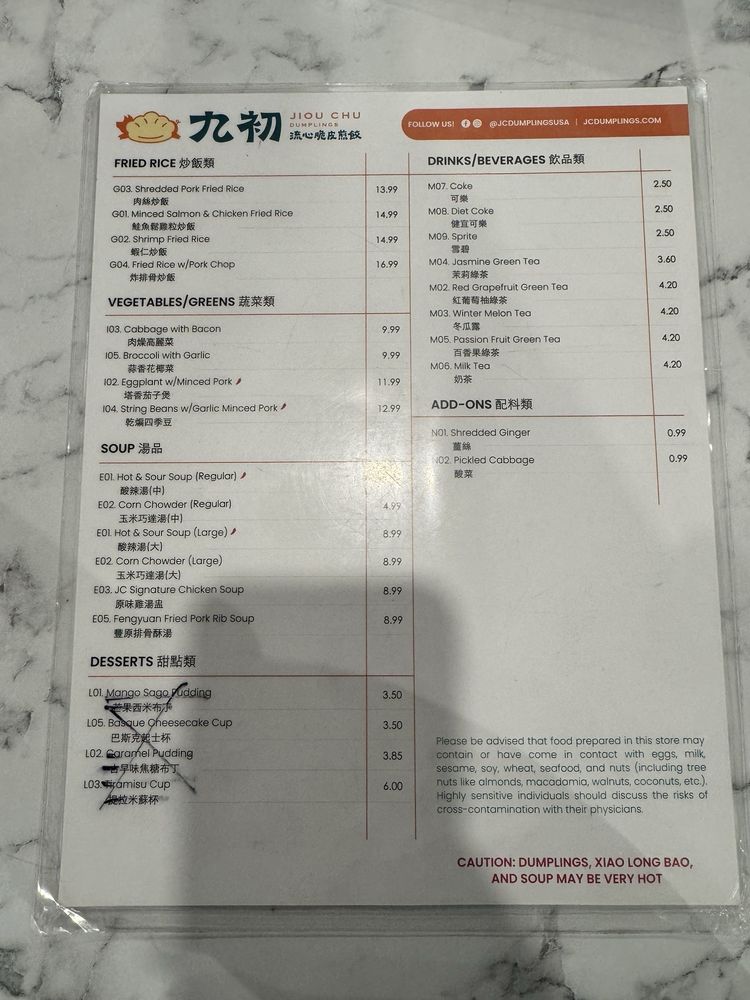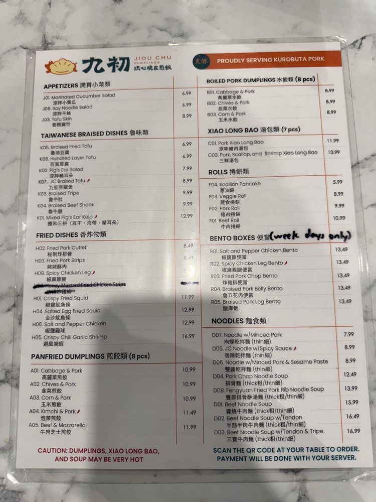 Jiou Chu Dumplings in Rowland Heights offers a cozy dining experience specializing in Taiwanese comfort food like noodles and dumplings. The menu includes options for vegans and limited vegetarian choices. The restaurant provides various amenities such as delivery, takeout, reservations, and catering services. With casual ambiance and attentive waiter service, it's a great spot for brunch, lunch, or dinner. The dishes like beef noodle soup, pork xiao long bao, and beef rolls are highly recommended by patrons for their flavors and authenticity. Additionally, the egg tarts receive high praise for their traditional pie crust and smooth custard filling. Overall, Jiou Chu Dumplings promises a delightful dining experience with quick service and flavorful dishes that cater to diverse preferences.